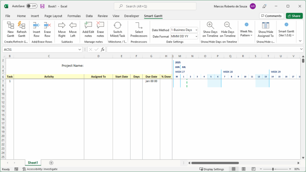At the top left corner, there’s a dedicated area where you can enter your project name. You can also rename the worksheet tab, which helps when managing multiple Gantt charts in the same workbook.